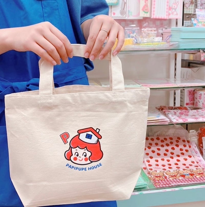 パピプペハウスロゴのPガールの顔がデザインされたランチトートバッグ。